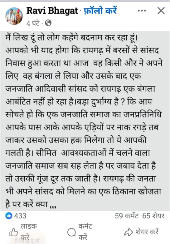 यहां बता दें कि रायगढ़ लोकसभा क्षेत्र के सांसद राधेश्याम राठिया के पास अपना सरकारी आवास व कार्यालय नहीं है। रायगढ़ लोकसभा में तीन जिले रायगढ़, जशपुर और सारंगढ़ आते हैं। तीनों जिला मुख्यालय में भी सांसद का कोई सरकारी आवास नहीं है। ऐसे में आम लोगों को सांसद जी से मिलने उनके गृह ग्राम छर्राटांगर जाना पड़ता है। ऐसे में रवि भगत के इस पोस्ट से बहस छिड़ गई है कि आखिर सांसद को जिला मुख्यालय में सरकारी आवास क्यों एलाट नहीं किया गया। जिससे आम लोग उनसे सुगमता से मिल सकें।