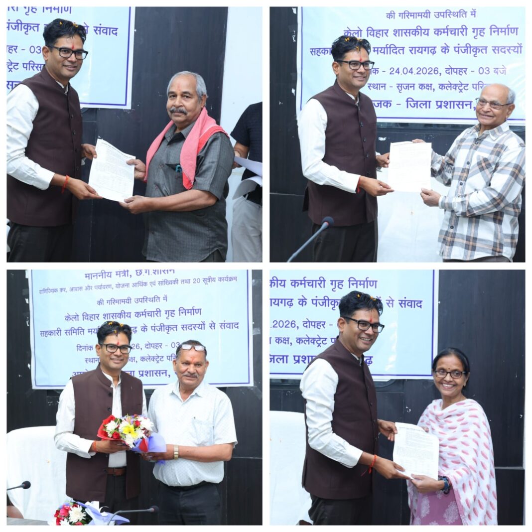 इसी प्रकार 1500 वर्गफुट श्रेणी में श्री आई.एस. परिहार, श्री केदारनाथ प्रधान एवं श्रीमती बासंती सरकार को, 1200 वर्गफुट श्रेणी में श्री खगेश्वर पटेल एवं श्री मथुरा प्रसाद नामदेव को मांग पत्र जारी किया गया। वहीं 960 वर्गफुट श्रेणी में श्री सूर्यकुमार पांडा, श्री त्रिलोकी नाथ पुजारी, श्रीवत्स पांडा एवं श्री बालकृष्ण डनसेना को पट्टा प्रदान किया गया। जिला प्रशासन द्वारा जानकारी दी गई कि समिति से संबंधित कुल 103 पात्र हितग्राहियों का चिन्हांकन किया गया है तथा शेष प्रकरणों में भी नियमानुसार कार्यवाही की जा रही है। इस अवसर पर जिला पंचायत के मुख्य कार्यपालन अधिकारी श्री अभिजीत बबन पठारे, अपर कलेक्टर श्री रवि राही, संयुक्त कलेक्टर श्री राकेश गोलछा, जिला प्रशासन के अधिकारीगण, कर्मचारीगण, समिति पदाधिकारी एवं पंजीकृत सदस्य उपस्थित रहे।
