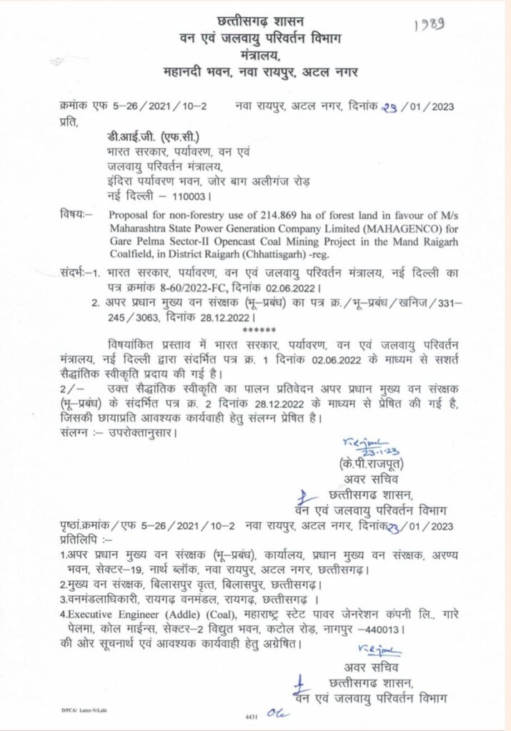 इसी तरह 28 दिसम्बर 2022 को प्रधान मुख्य वन संरक्षक एवं वन बल प्रमुख, छत्तीसगढ़ के कार्यालय से पत्र क्रमांक क्र/भू-प्रबन्ध/खनिज/331-245/3063 जारी किया गया। इसमें तत्कालीन अधिकारी सुनील मिश्रा के हस्ताक्षर से बाकायदा फारेस्ट क्लियरेंस की अनुशंसा की गयी है।