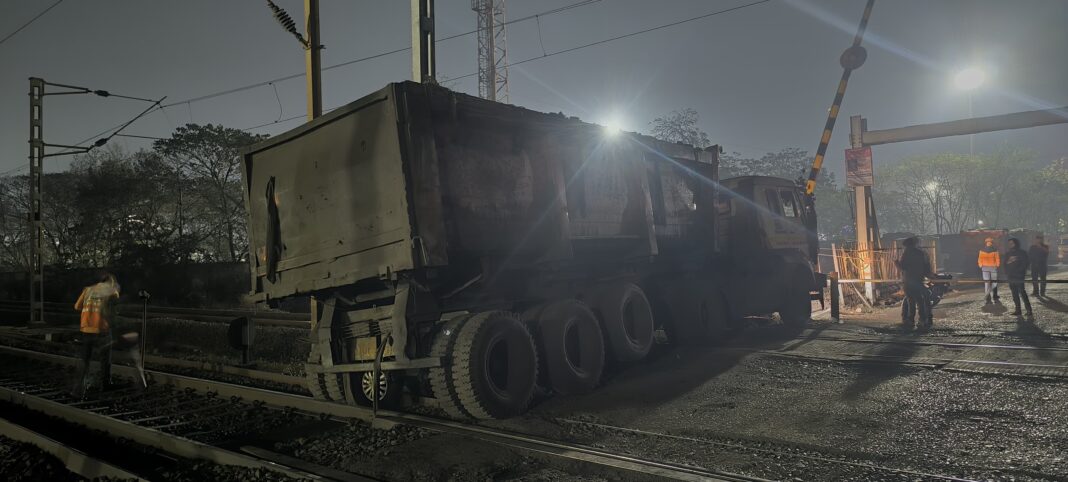 रायगढ़। जिले के भूपदेवपुर थाना क्षेत्र अंतर्गत नहरपाली फाटक के पास तेज रफ्तार कोयला लोड ट्रेलर ने रेलवे फाटक के लीवर क्रासिंग में जोरदार टक्कर मार दी, जिससे ट्रेलर का अगला हिस्सा बुरी तरह क्षतिग्रस्त हो गया और लीवर क्रासिंग पूरी तरह टूट गई है। हादसे के बाद ट्रेलर रेलवे ट्रैक के ठीक बीचों-बीच फंस गया, जिसके चलते रेल यातायात बाधित हो गया है। यह घटना आज दिनांक 31 जनवरी 2026 की रात करीब 1:30 बजे की बताई जा रही है। मौके पर मौजूद रेलवे कर्मचारियों ने तत्काल आरपीएफ को सूचना दी, वहीं ट्रेलर का चालक दुर्घटना के बाद फरार हो गया है। फिलहाल रेलवे ट्रैक पर फंसे ट्रेलर को हटाने के लिए बड़े अधिकारियों को सूचित कर दिया गया है और जल्द ही रेस्क्यू कार्य शुरू किए जाने की तैयारी की जा रही है। स्थिति को सामान्य करने के प्रयास जारी हैं और आगे की कार्रवाई पर सबकी नजर बनी हुई है।*