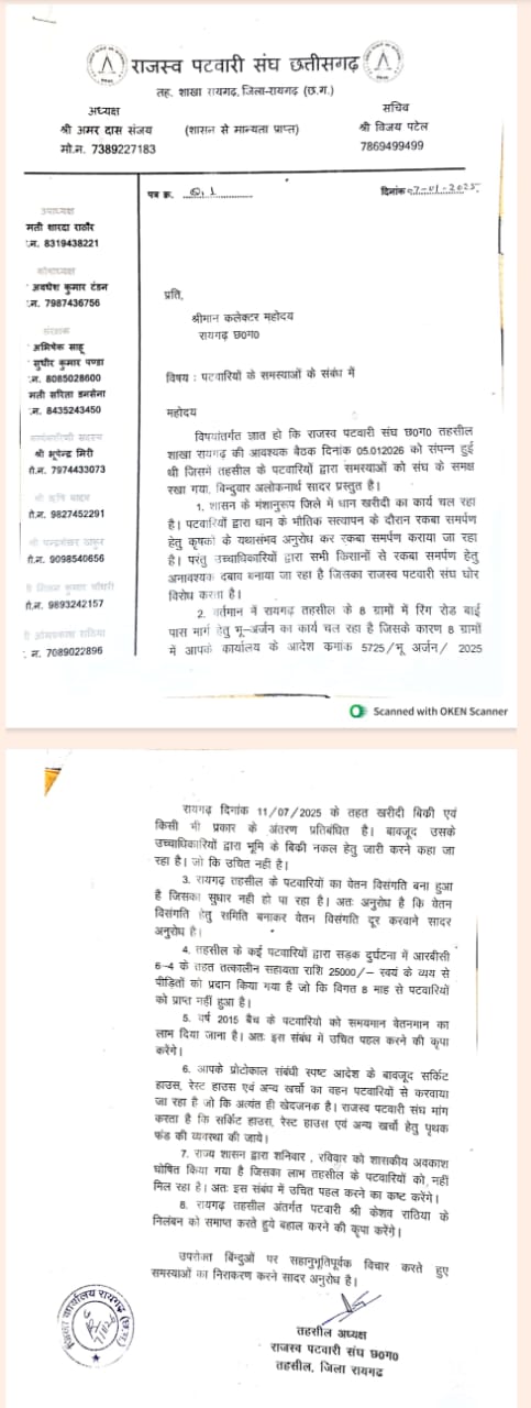संघ ने बताया कि रायगढ़ तहसील के 8 ग्रामों में रिंग रोड बायपास मार्ग हेतु भूमि अर्जन का कार्य चल रहा है। बावजूद इसके, 11 जुलाई 2025 के बाद की खरीदी-बिक्री एवं अंतरण को अमान्य मानते हुए विक्रय नकल जारी करने के निर्देश दिए जाने को लेकर संघ ने नियम विरुद्ध बताते हुए आपत्ति जताई गई है।